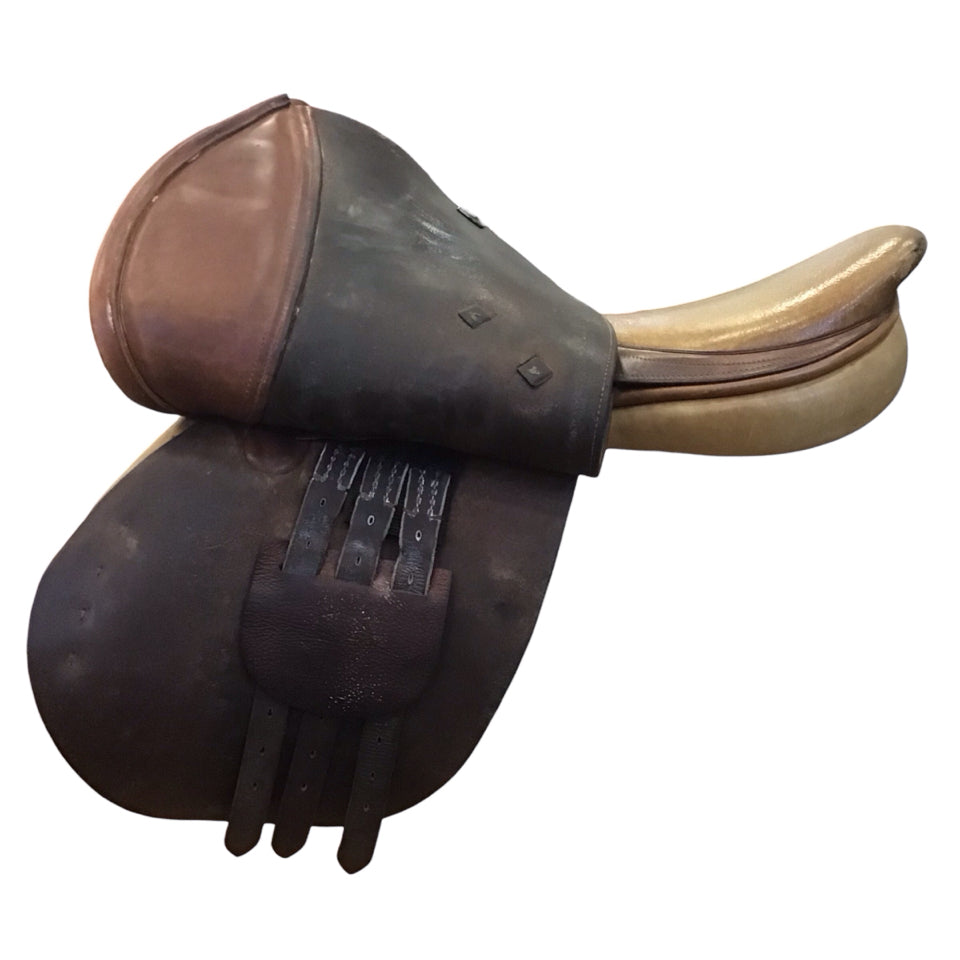 17" Beval World Cup Wide Used Hunter/Jumper Saddle: Has no stamp, "W" engraved on stirrup bar. Has wear on cantle *pictured
